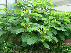 形態特徵: 粗狀直立灌木,幼枝和幼葉有下垂現象,一回羽狀複葉,互生,小葉 8~14 對,最頂端一對最大。 秋至春季開花,花黃色,多數,自花梢頂生,呈總狀花序排列;花序長50~70公分,先呈覆瓦狀排列,後脫落;花苞尖端褐黃,下部金黃,老化的花苞逐漸由下部脫落,顯露出細緻的花梗,花色豔麗。 果實為莢果有翼,線形,長12~18 公分,寬 2.5 公分,四周有寬闊的翼狀物,成熟時沿著腹縫線開裂,內有種子50~70枚;種子菱狀楔形,扁平。 樹姿優美顯眼,花香葉綠,是常見的觀花及觀果植物。
